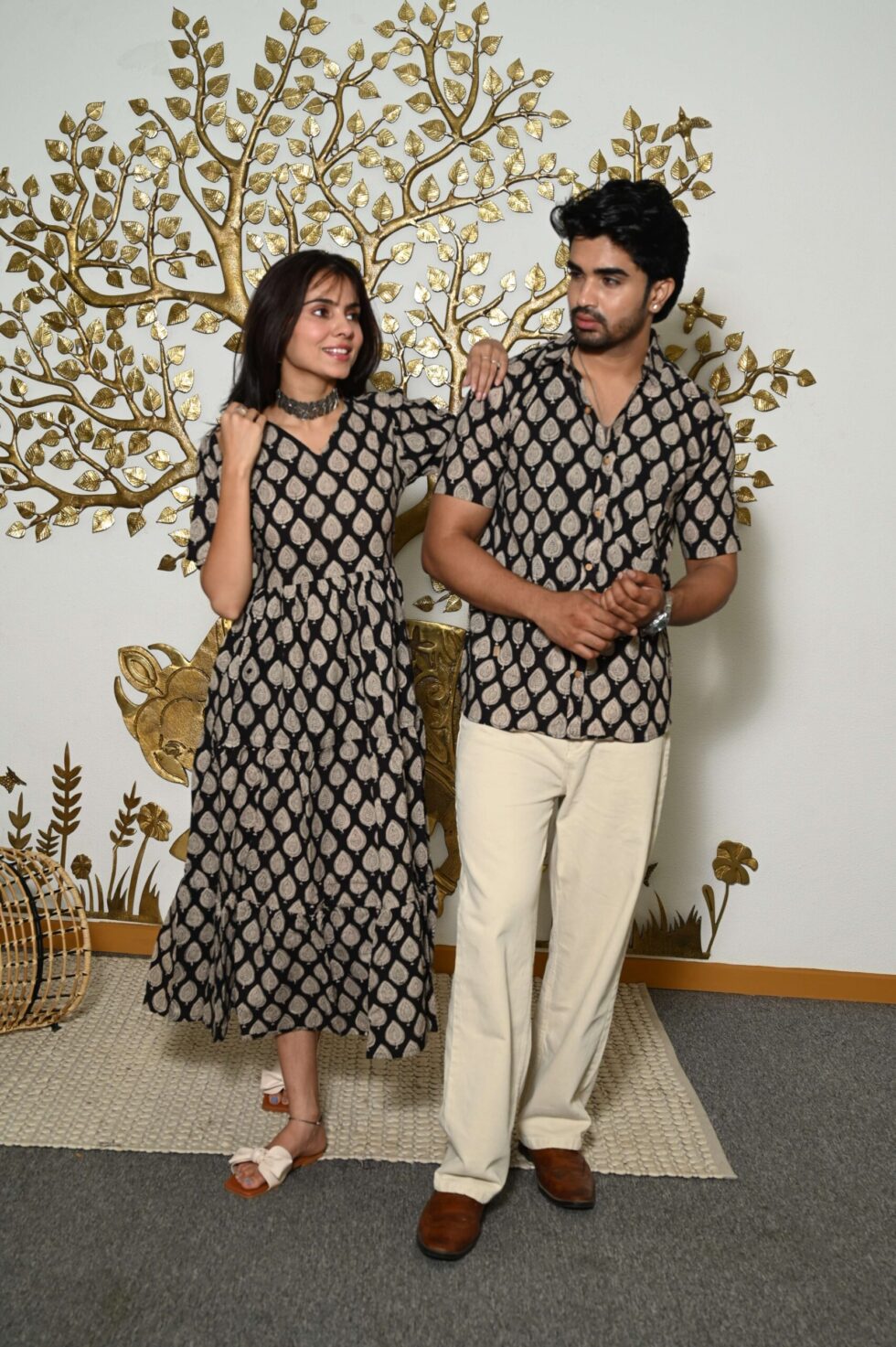This Black & Beige floral Printed couple matching outfit includes a women?s flowy cotton midi dress and a men?s short-sleeve printed shirt. Designed with cheerful yellow floral prints, this set is perfect for summer outings, casual gatherings, or twinning on vacations.
